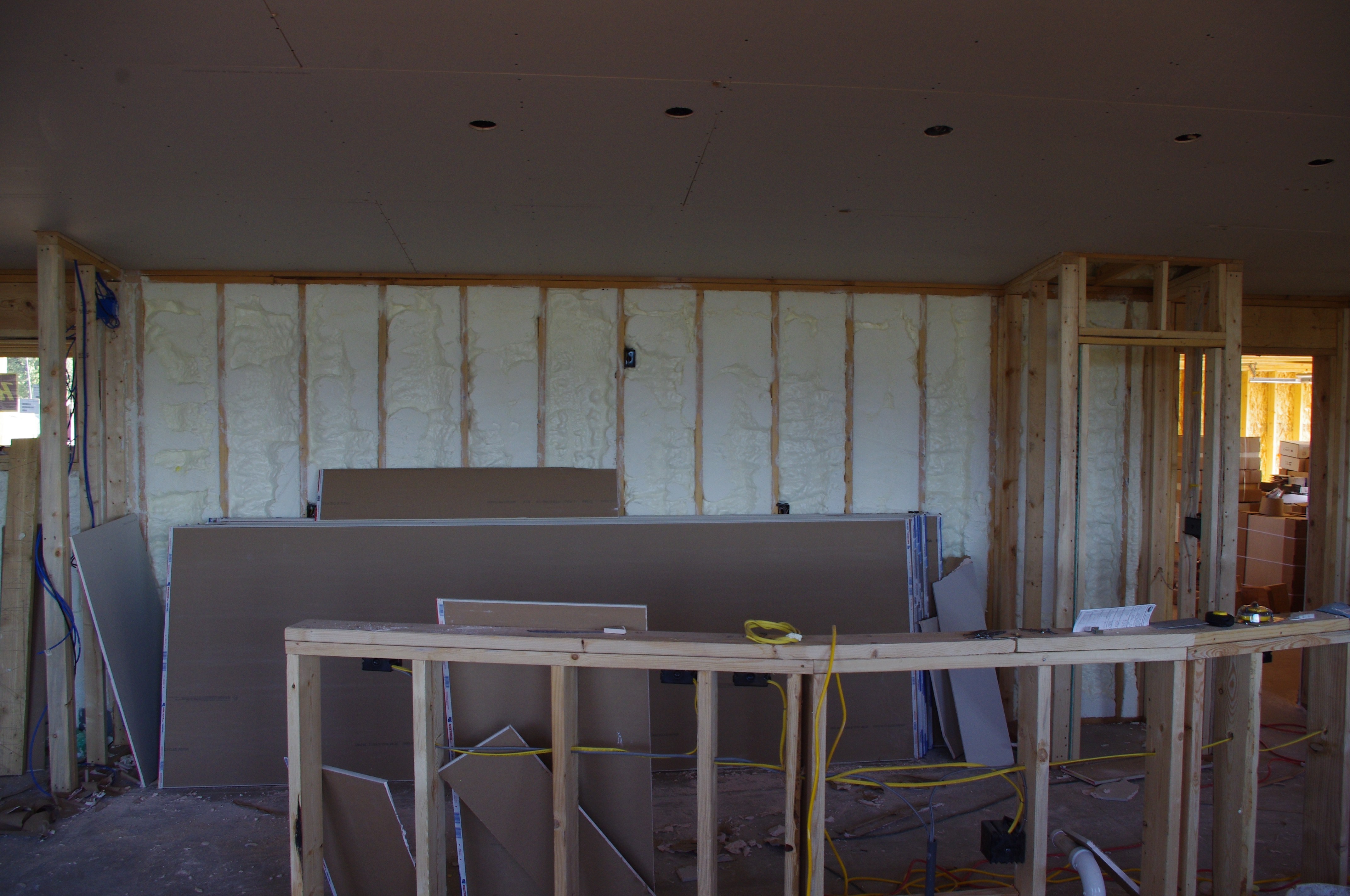 Things are looking rather chaotic up at construction central this week. We finished the spray insulation on Monday. Think of it as dried up marshmallows pumped into your exterior walls…