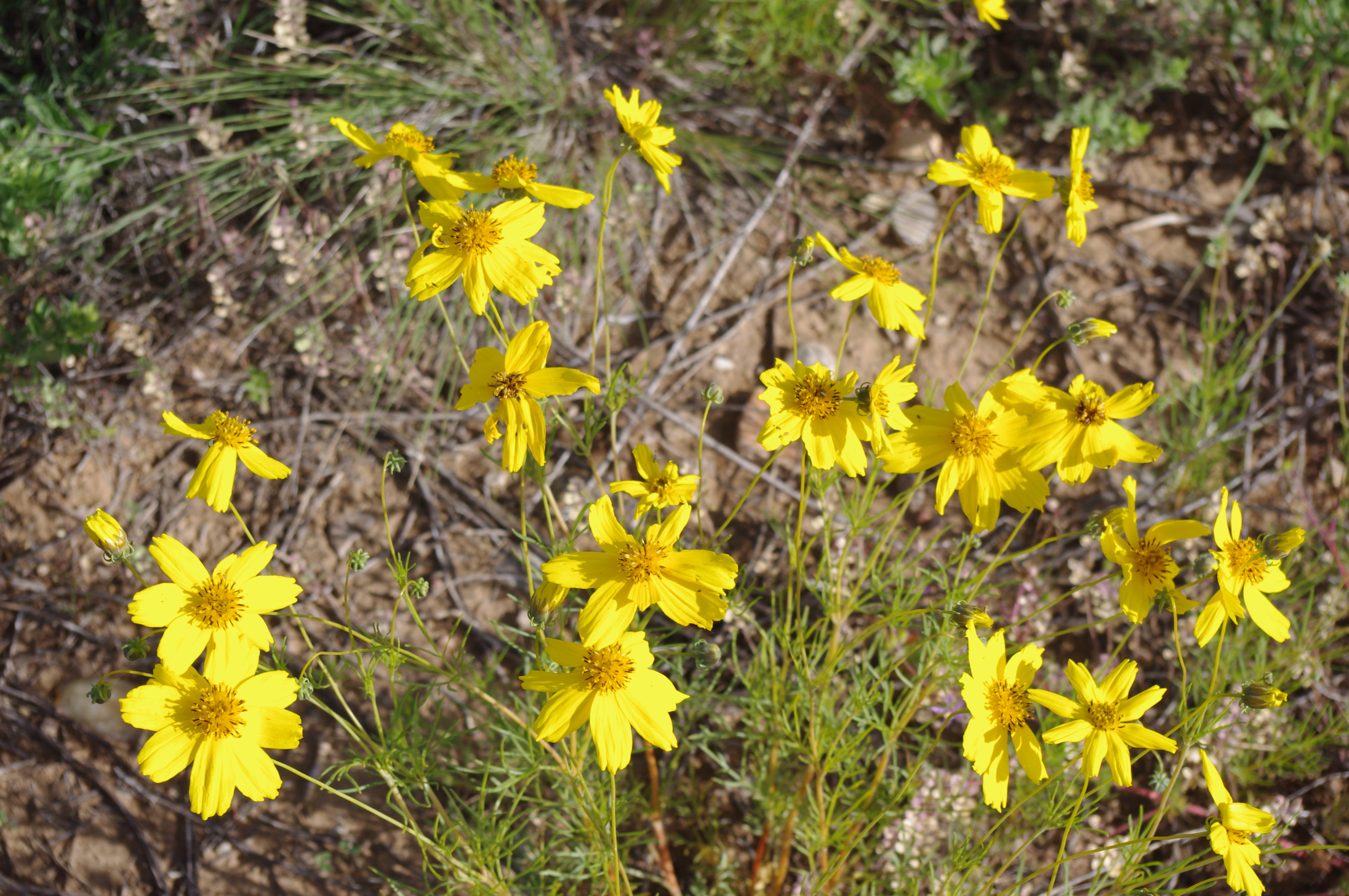 IMGP3696Especially these yellow flowers called Plains Greenthread (or Navajo Tea), but we also have Indian Paintbrush, Lupines and a couple Penstemons around.