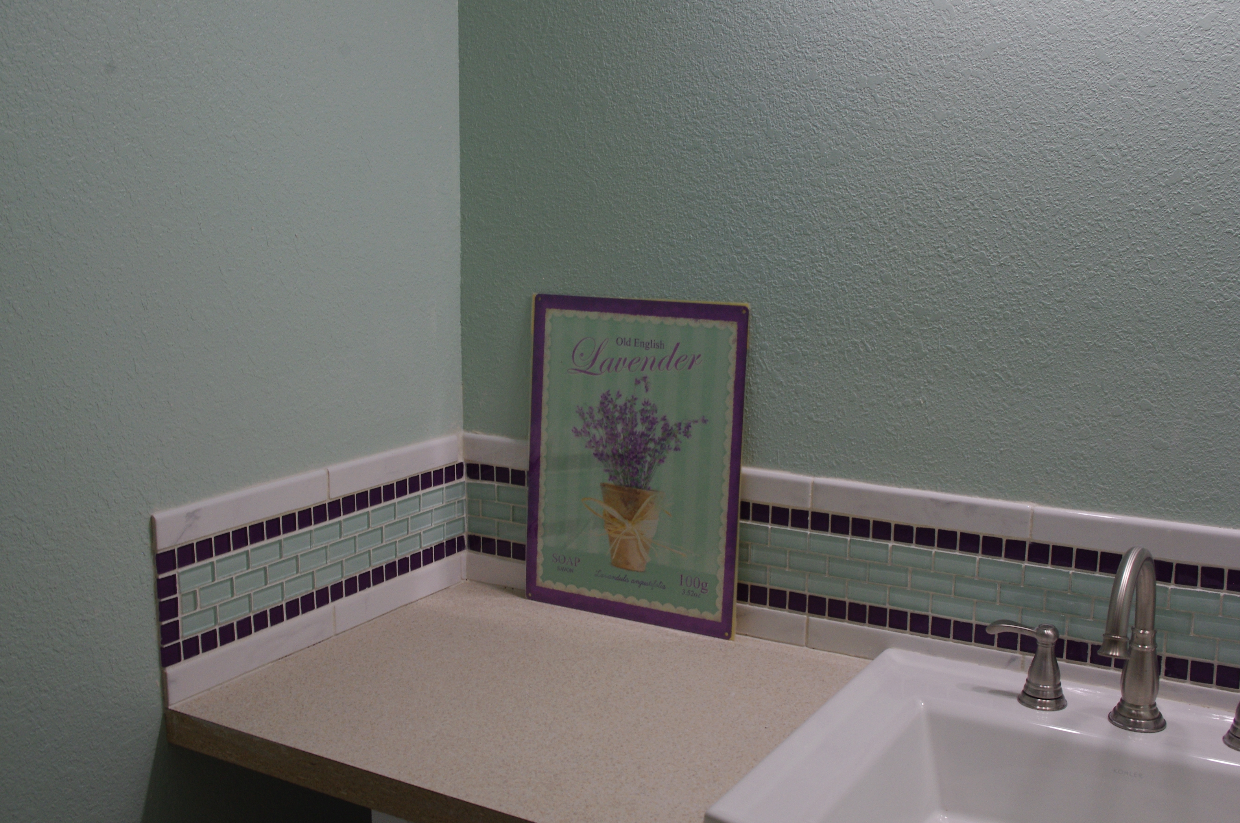 IMGP3926At least Kristy helped me get my fancy bath back splash done this week! I planned the whole bath around the colors in that tin lavender sign, and I’m really happy with the results! This photo doesn’t show the colors exactly how they look.