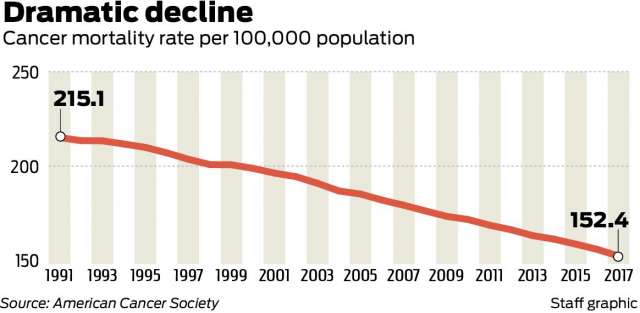 This 26-year decline in our overall cancer mortality rate, a 29 percent drop, translates to roughly 2.9 million fewer deaths than there would have been had the rates remained the same. In contrast, less impressive results remain for other major causes of death, such as heart disease, whose mortality rate has slowed; stroke and other cerebrovascular disease, whose rate has stabilized; and accidents, Alzheimer’s disease and suicides, rates which continue to increase.